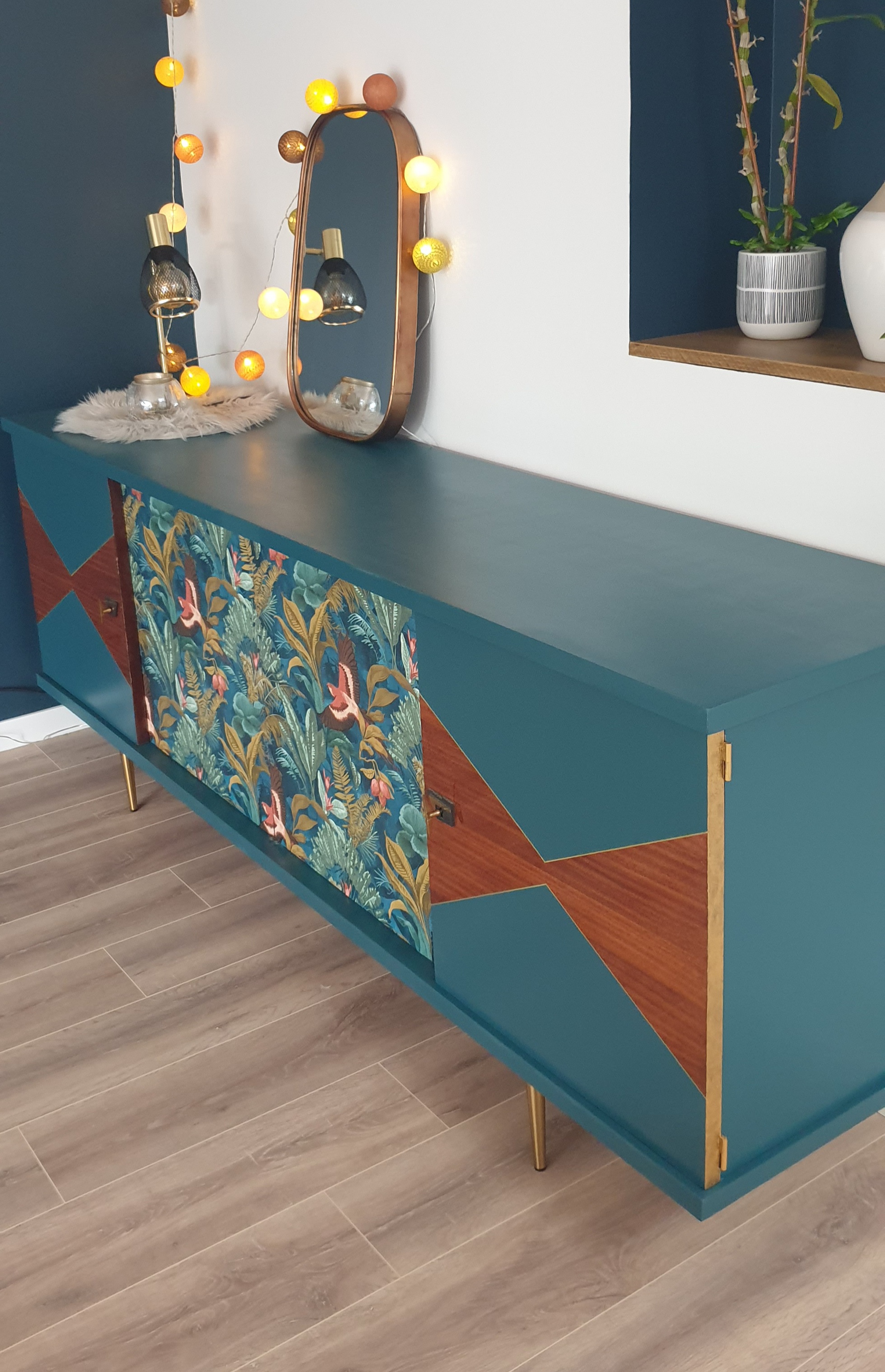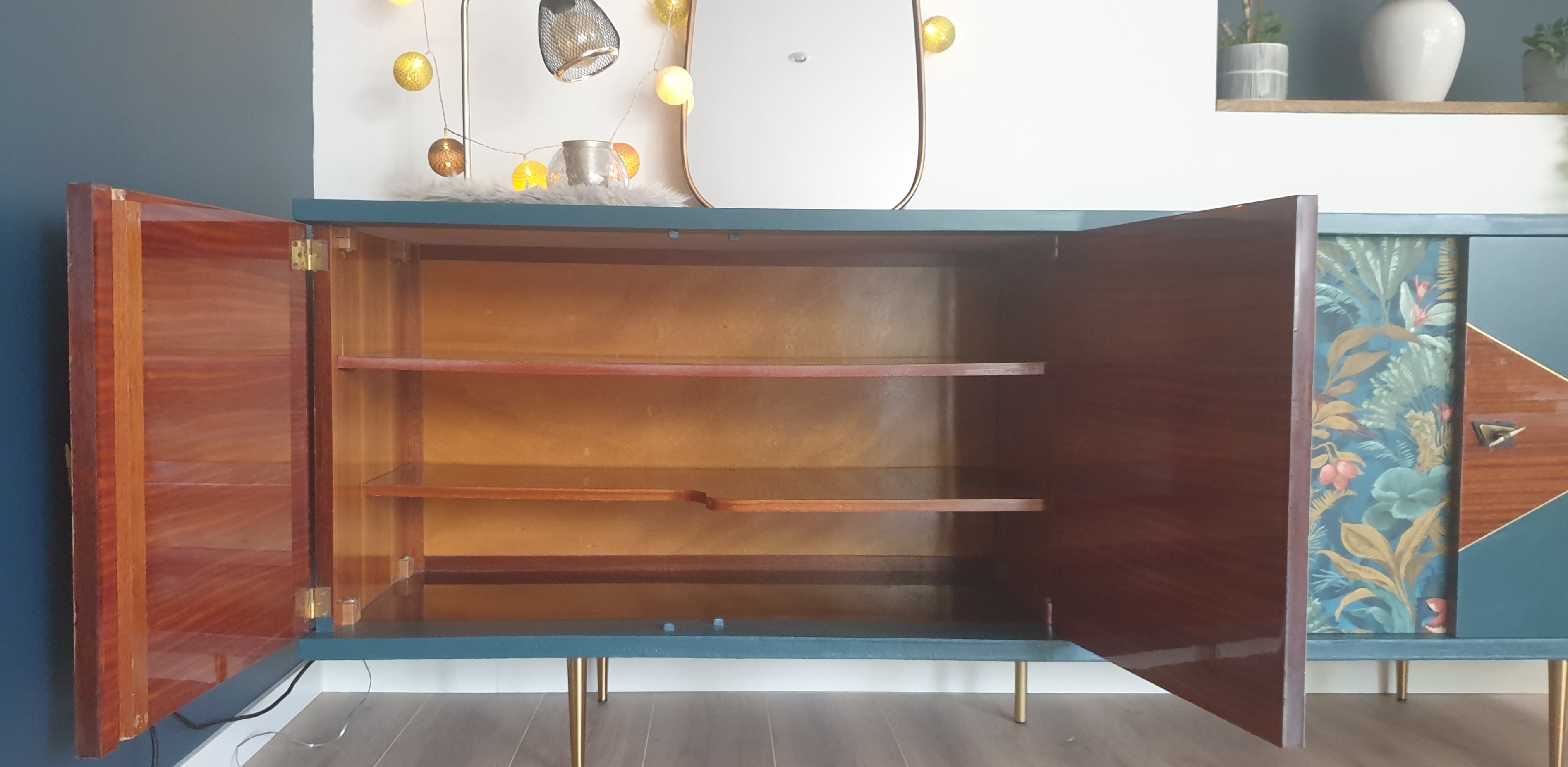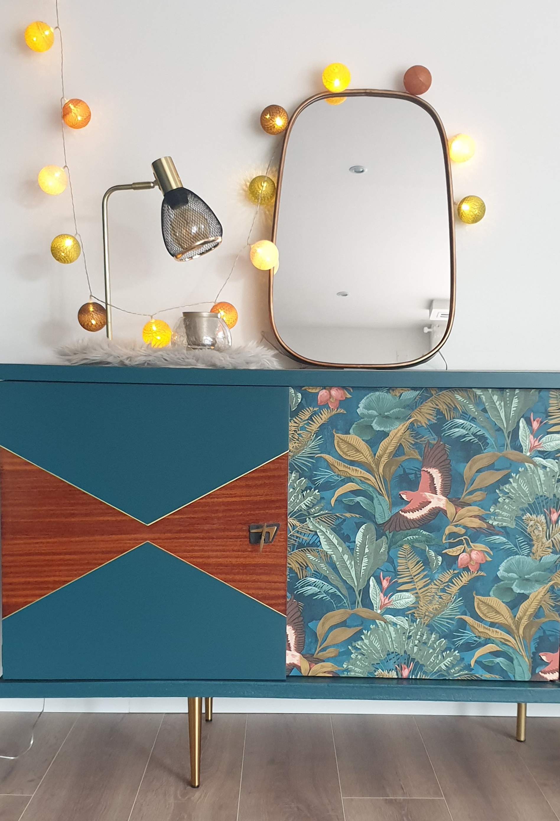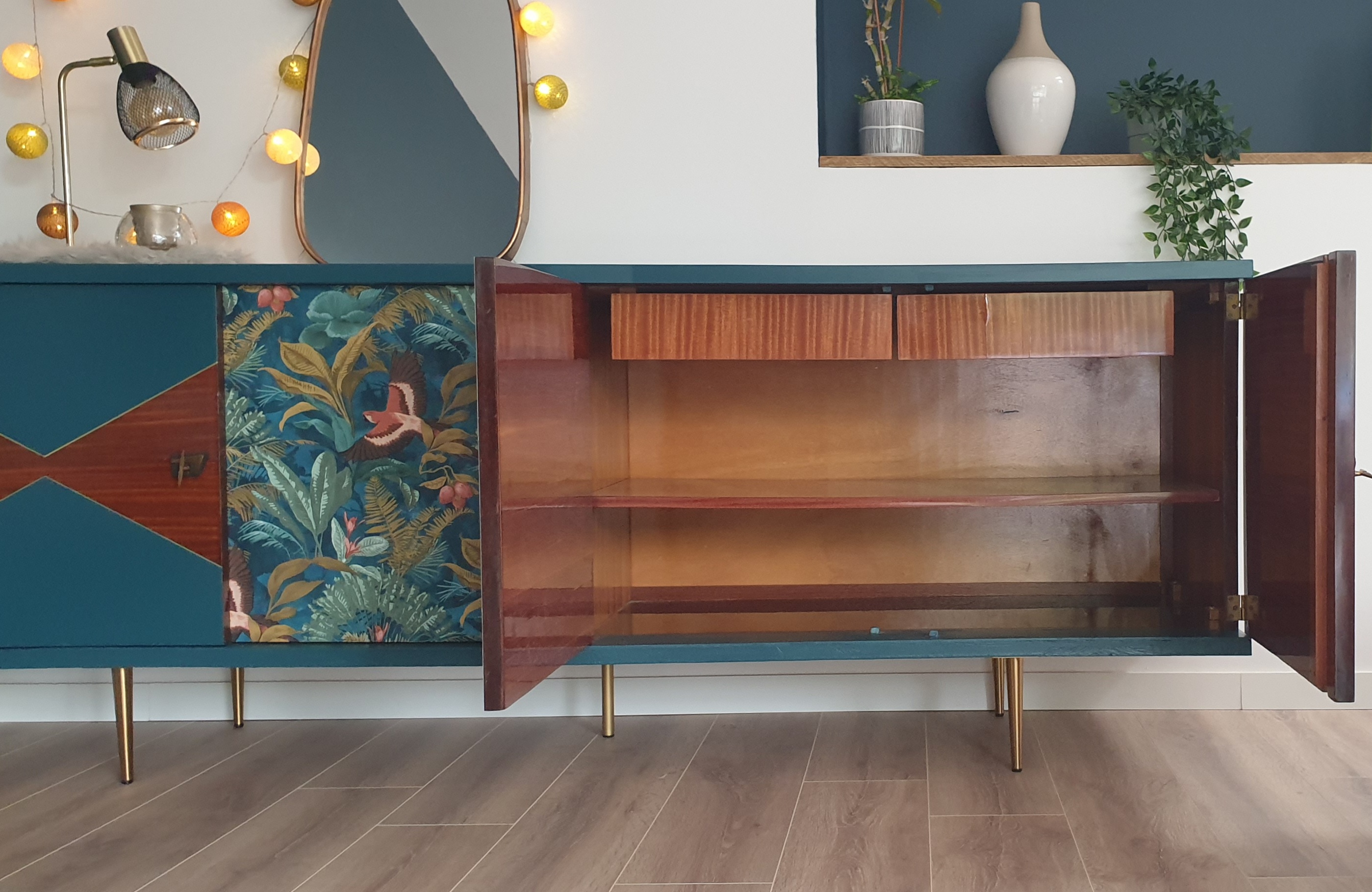 - Sur les façades des placards, motifs géométriques avec peinture bleue et papier peint tropical chic