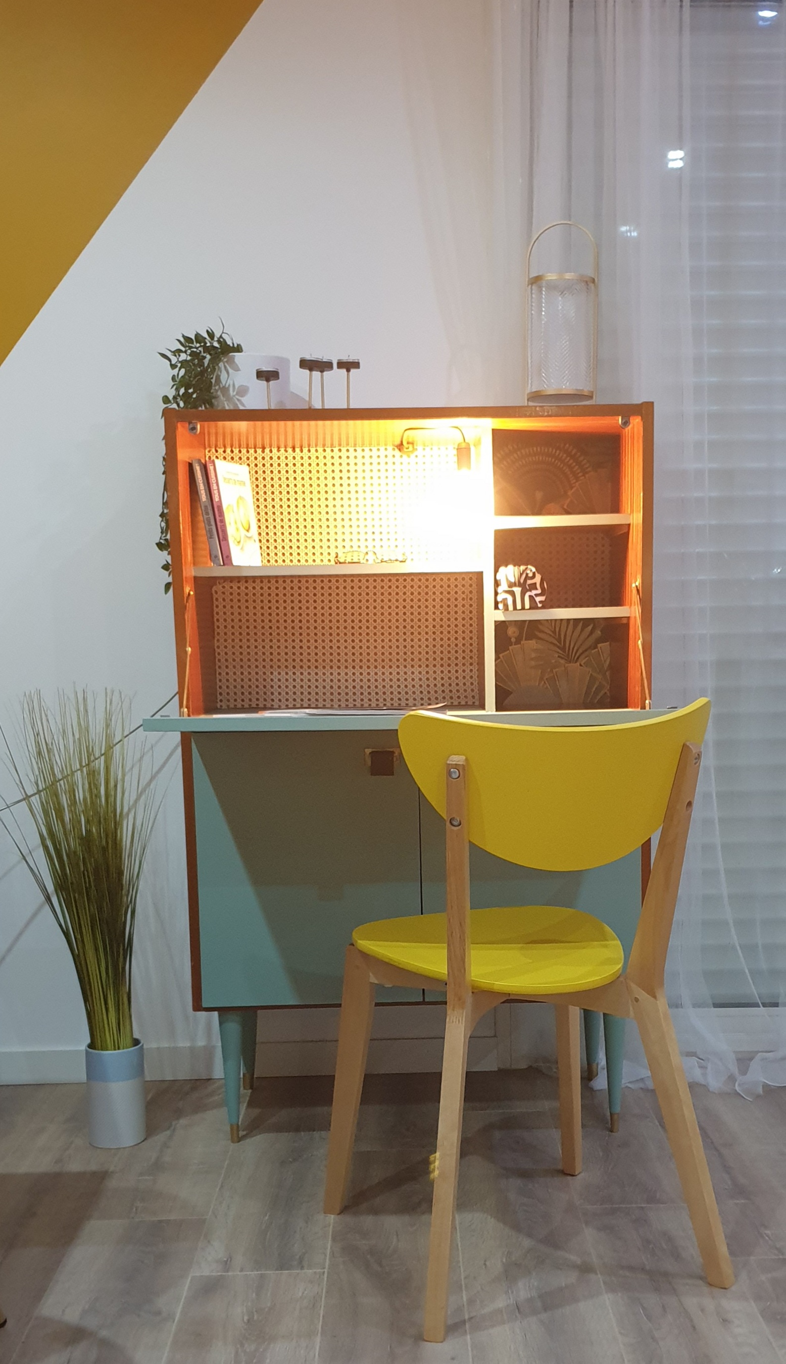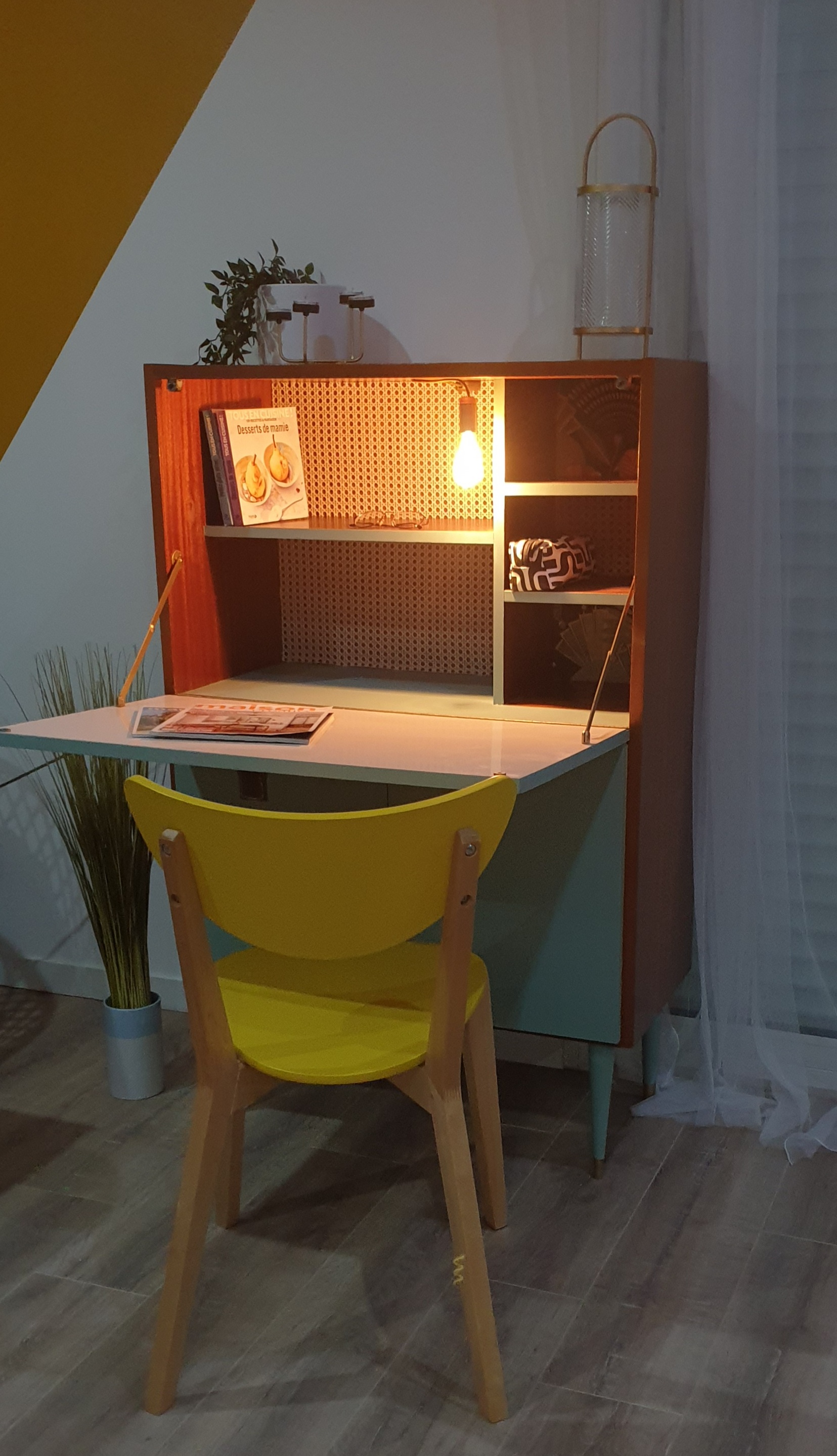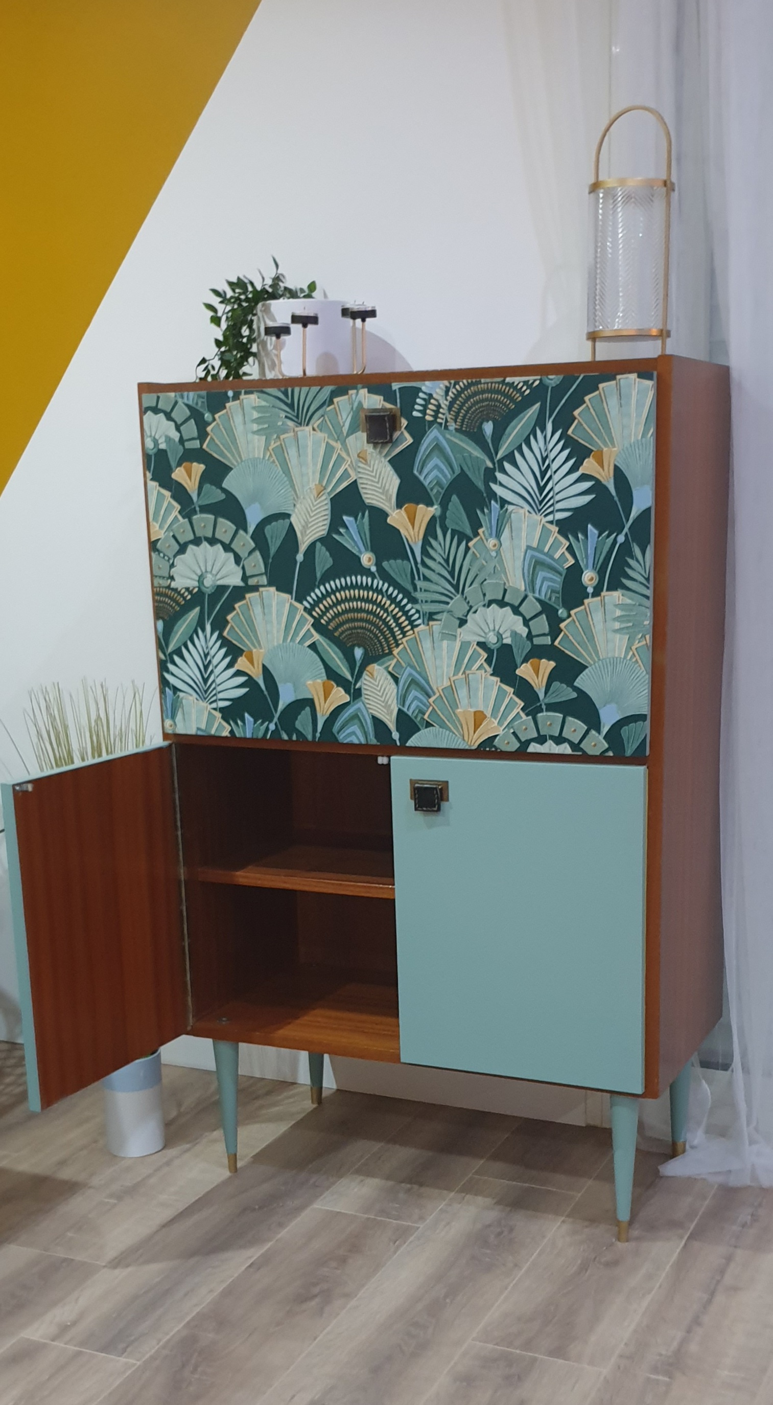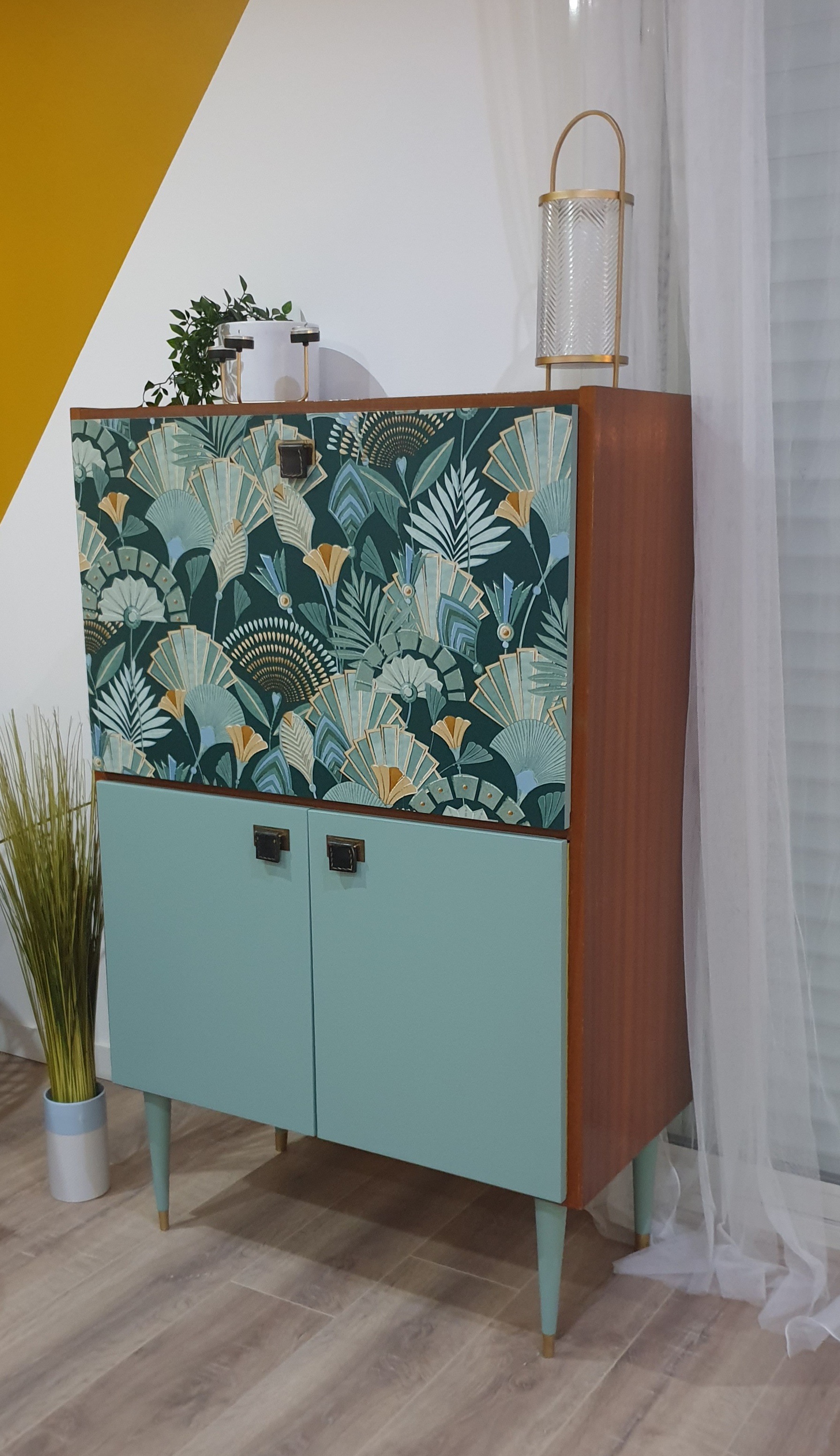 - Face extérieure du secrétaire avec un papier peint géométrique chic